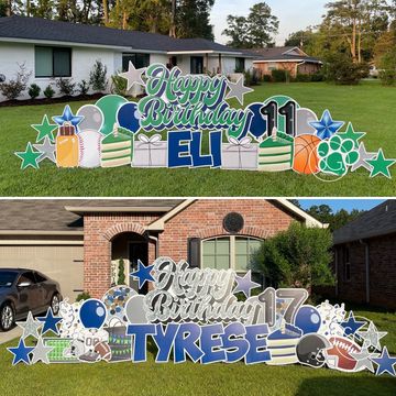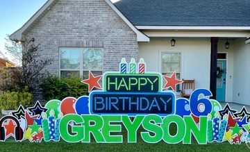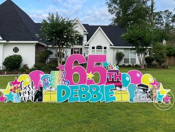 This greeting package is a classic and is the largest style we offer with greetings spanning 20-30 feet. This greeting will spell out HAPPY BIRTHDAY with each individual letter and comes with one name and coordinating graphics. Additional names can be added for $10 each. Mega numbers or photo frames can be added for $10 more. Use the CELEBRATION BOOKING FORM button to request a booking for a full happy birthday set up. Request your preferred letterset on the form. Opening price is $100.