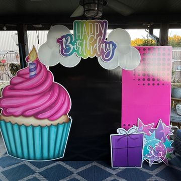 Cream & silver gray mega cupcake with 1 backdrop panel and 7-8 graphics. Can be customized for HBD, Sweet 16, Anniversary, etc.