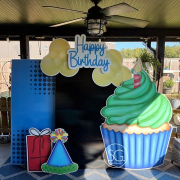 Blue & green mega cupcake with 2 backdrop panels & 5-6 graphics